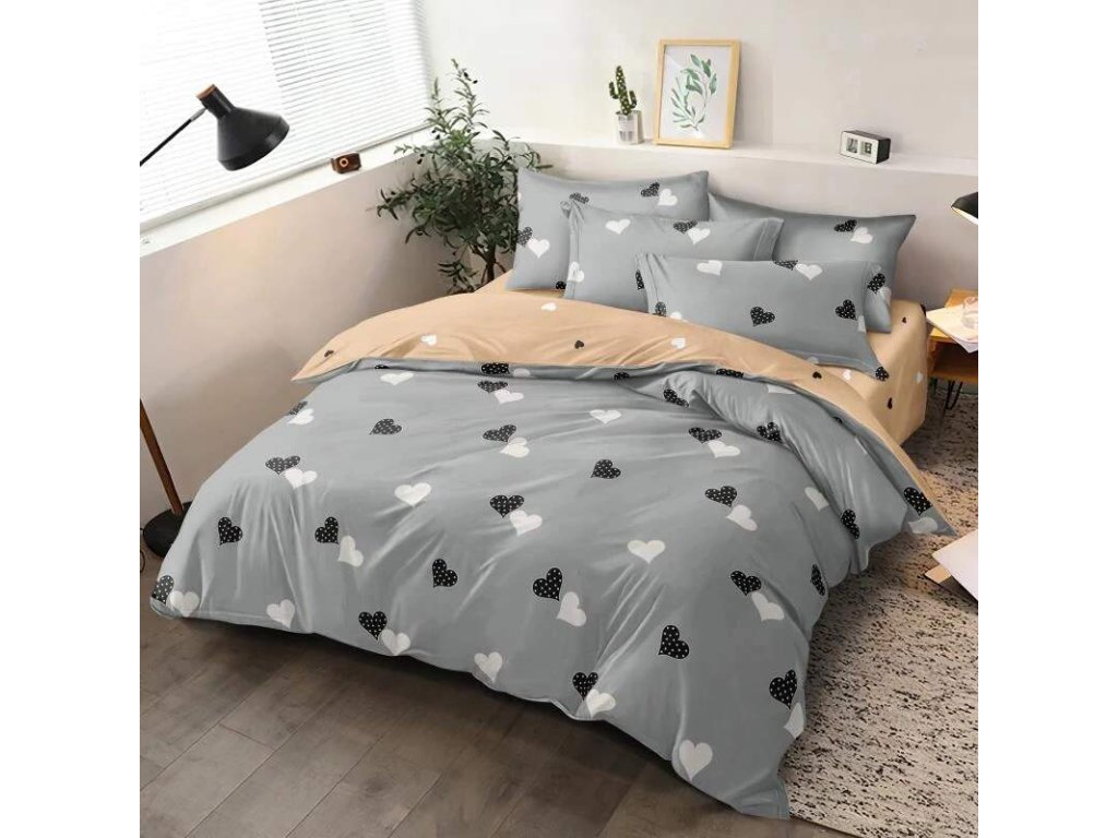 LUXUSNÍ BAVLNĚNÉ OBOUSTRANNÉ POVLEČENÍ na 2 postele 140x200/70x90 cm - HEART ŠEDO- BÉŽOVÉ + PROSTĚRADLO ZDARMA