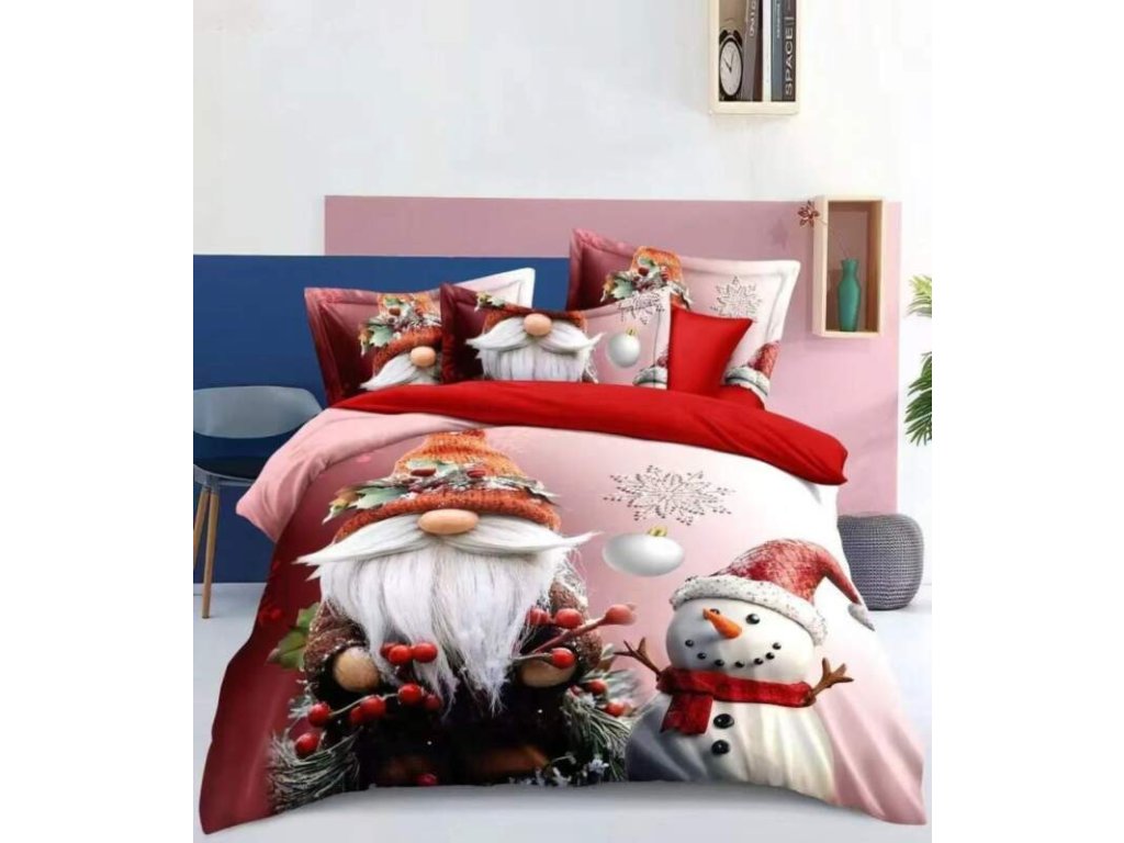 Novinka 2025! Sada vánočního bavlněného povlečení s 3D efektem pro 2 postele 140x200/70x90 cm – VÁNOCE / MERRY CHRISTMAS - Skřítek a Sněhulák + PROSTĚRADLO ZDARMA !
