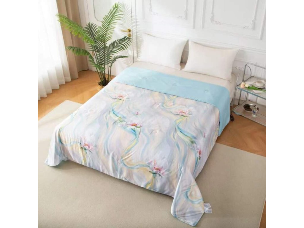 Lehká a vzdušná oboustranná francouzská přikrývka. Z jedné strany nebesky modrá, z druhé jemný vzor. Ideální na spaní i jako stylový přehoz přes velkou postel.