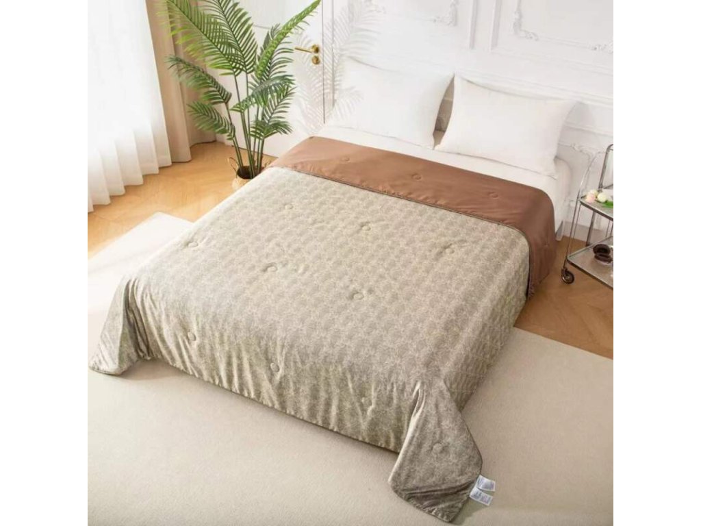 Lehká a vzdušná francouzská přikrývka v hnědo-béžových tónech s veselým motivem ananasů na světlé straně. Tropická nálada a pohodlí pro horké letní noci.