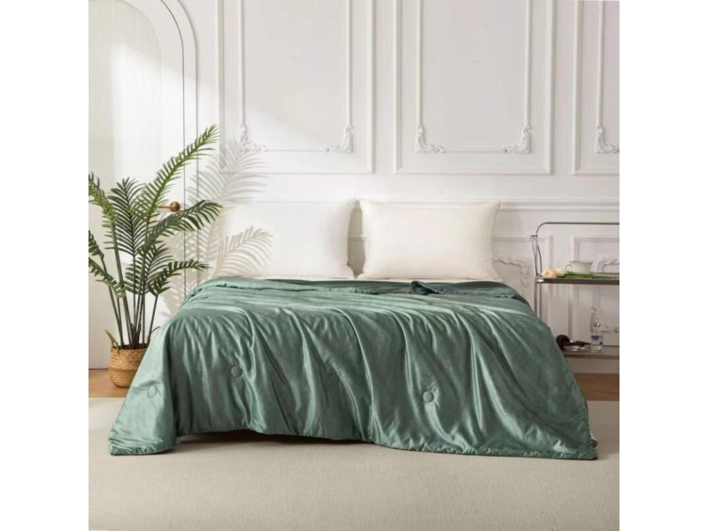 Oboustranná letní přikrývka v osvěžující zelené barvě se stylovým vzorem, která přinese do vaší ložnice přírodní klid a eleganci. Lehká, měkká a praktická – ideální na spaní i jako přehoz.