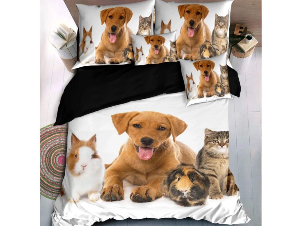 Roztomilý a hravý motiv mazlíčků – psa, kočky a morčete – s živým 3D fototiskem, který vnesou do vaší ložnice radost a pohodu.A navíc prostěradlo ZDARMA jako dárek!